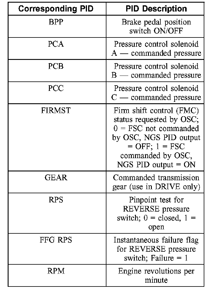 To confirm that the OSC value was sent by the NGS and the PCM has accepted the OSC substitution, a corresponding PID for each OSC parameter must be monitored. Additional PIDs should be monitored to help the technician adequately diagnose the transmission. The following is a list of OSC parameters and their corresponding PID: