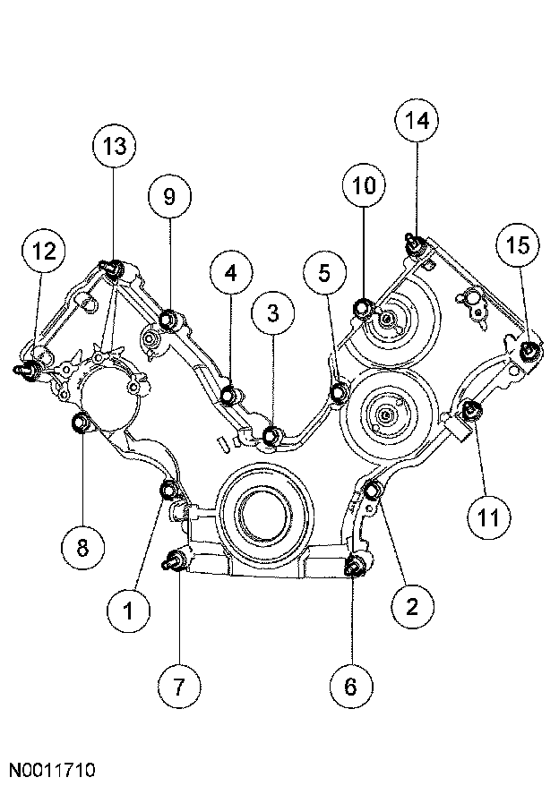 Tighten the engine front cover fasteners in sequence in 2 stages.
