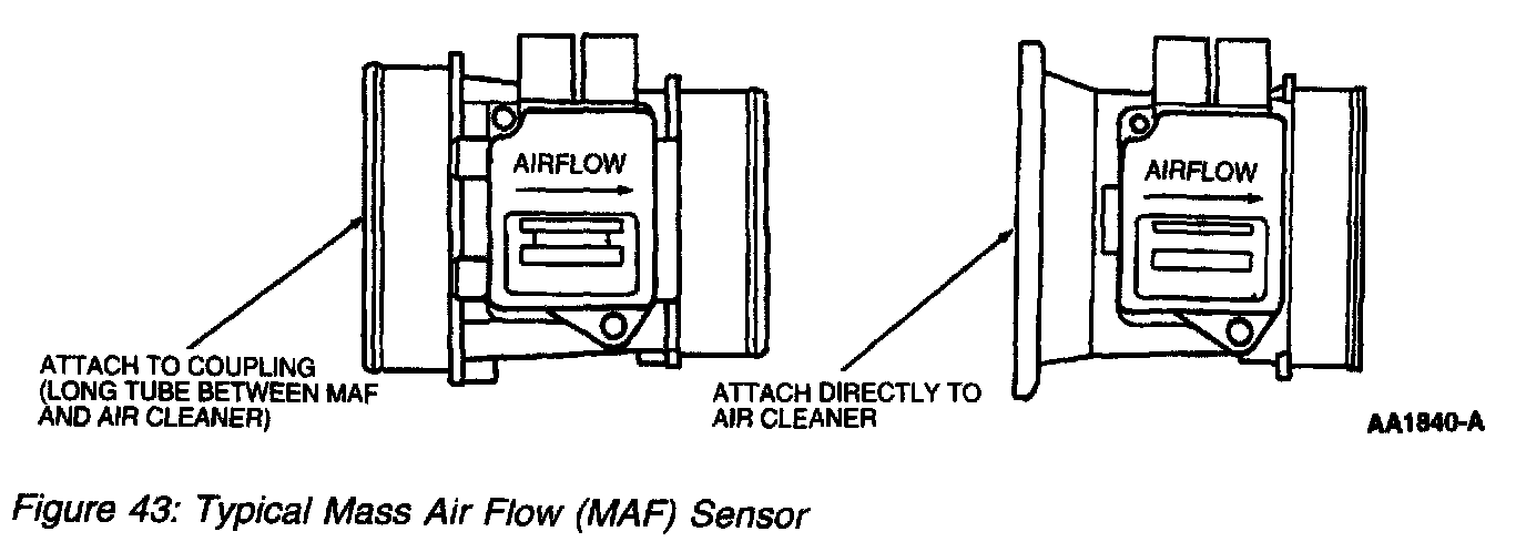 The MAF sensor uses a hot wire sensing element to measure the amount of air entering the engine. Air passing over the hot wire causes it to cool. This hot wire is maintained at 200°C (392°F) above the ambient temperature as measured by a constant cold wire. If the hot wire electronic sensing element must be replaced, then the entire assembly must be replaced. Replacing only the element may change the air flow calibration.