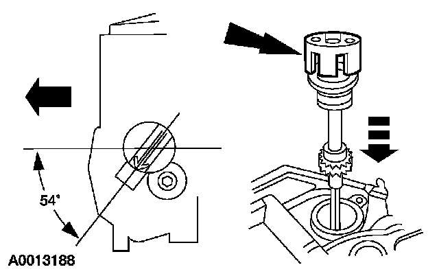 Install the camshaft synchronizer housing assembly so the arrow on the synchronizer alignment tool is 54 degrees from the centerline of the engine.