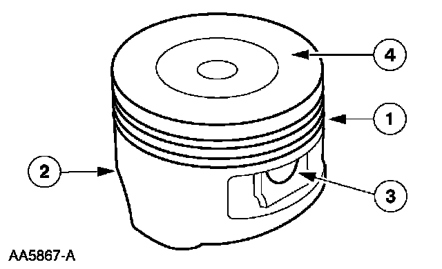 1. Clean and inspect the (1) ring lands, (2) skirts, (3) pin bosses, and the (4) tops of the pistons. If wear marks, scores or glazing is found on the piston skirt, check for a bent or twisted connecting rod.