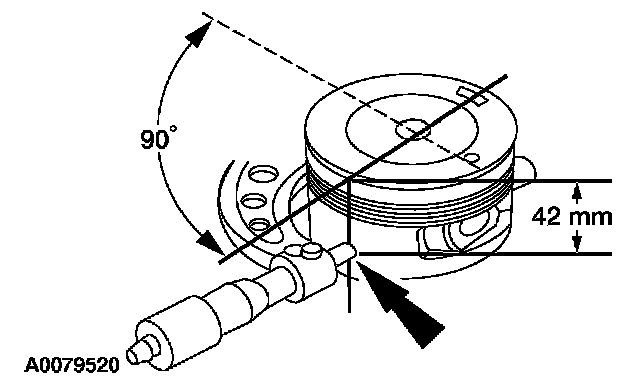 1. Measure the piston diameter 90 degrees from the piston pin and 42 mm down from the top of the piston at the point indicated.