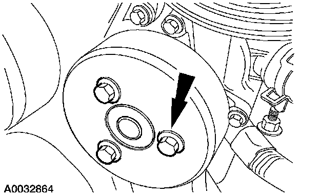 10. CAUTION: There is one bolt behind the cooling fan drive pulley. This bolt can be accessed by lining up one of the holes in the pulley with the bolt.