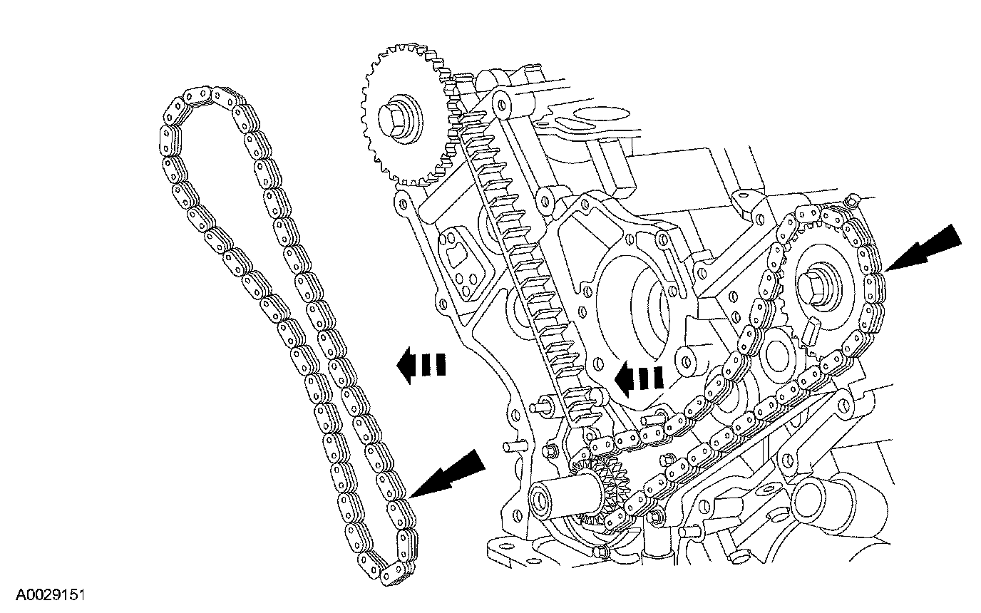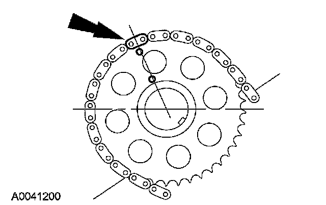 9. Install the LH timing chain on the camshaft sprocket, aligning the copper (marked) link with the timing marks on the sprocket.