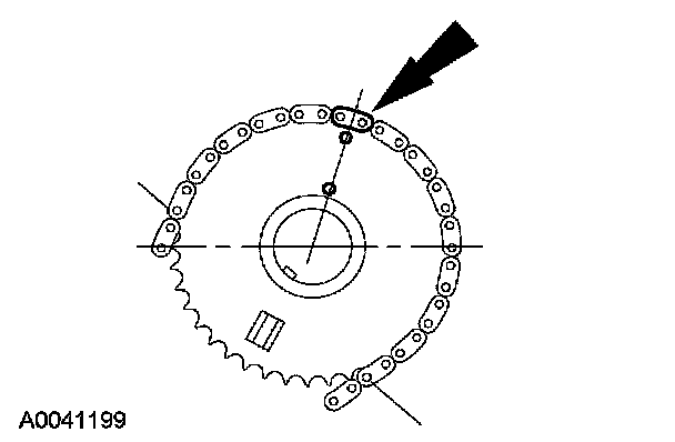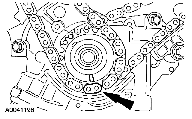 8. Position the LH (inner) timing chain on the crankshaft sprocket, aligning the copper (marked) link with the timing mark on the sprocket.