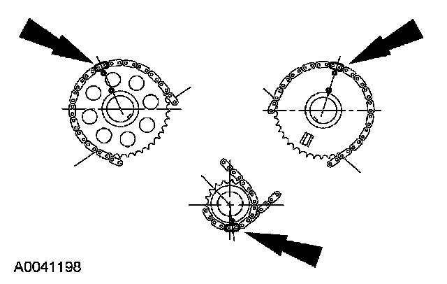 16. Make sure that the copper (marked) chain links are lined up with the dots on the crankshaft sprockets and the camshaft sprocket.