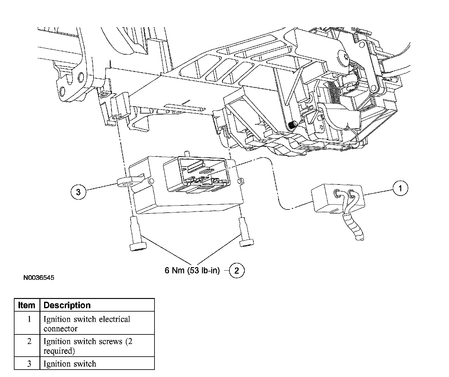 ^ To install, align the ignition switch with the slot and index mark on the steering column and tighten the screws to 6 Nm (53 inch lbs.).