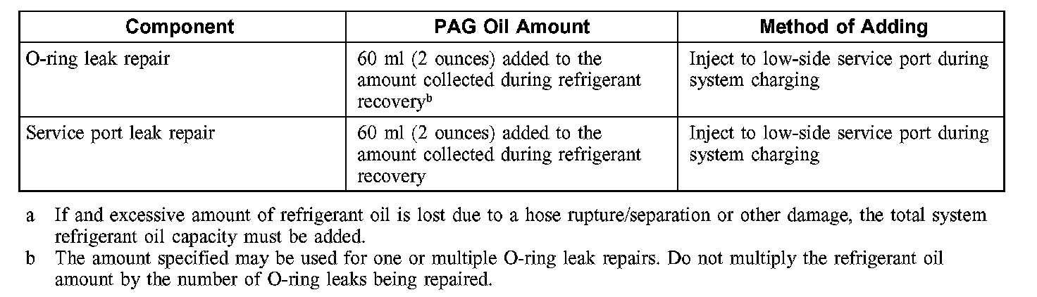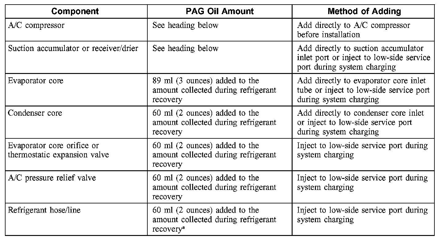 CAUTION: During normal A/C operation, oil is circulated through the system with the refrigerant, and a small amount is retained in each component. If certain components of the system are removed, some of the refrigerant oil will go with the component. To maintain the original total oil charge, it is necessary to compensate for the oil lost by adding oil to the system with the new part.