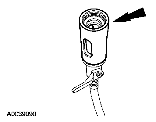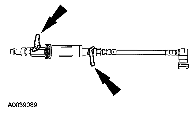 5. Install the dye/lubricant injector between the low-side service gauge port valve and the refrigerant service station or manifold gauge set.