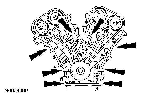 CAUTION: During engine repair procedures, cleanliness is extremely important. Any foreign material, including any material created while cleaning gasket surfaces that enters the oil passages, coolant passages or the oil pan, can cause engine failure.