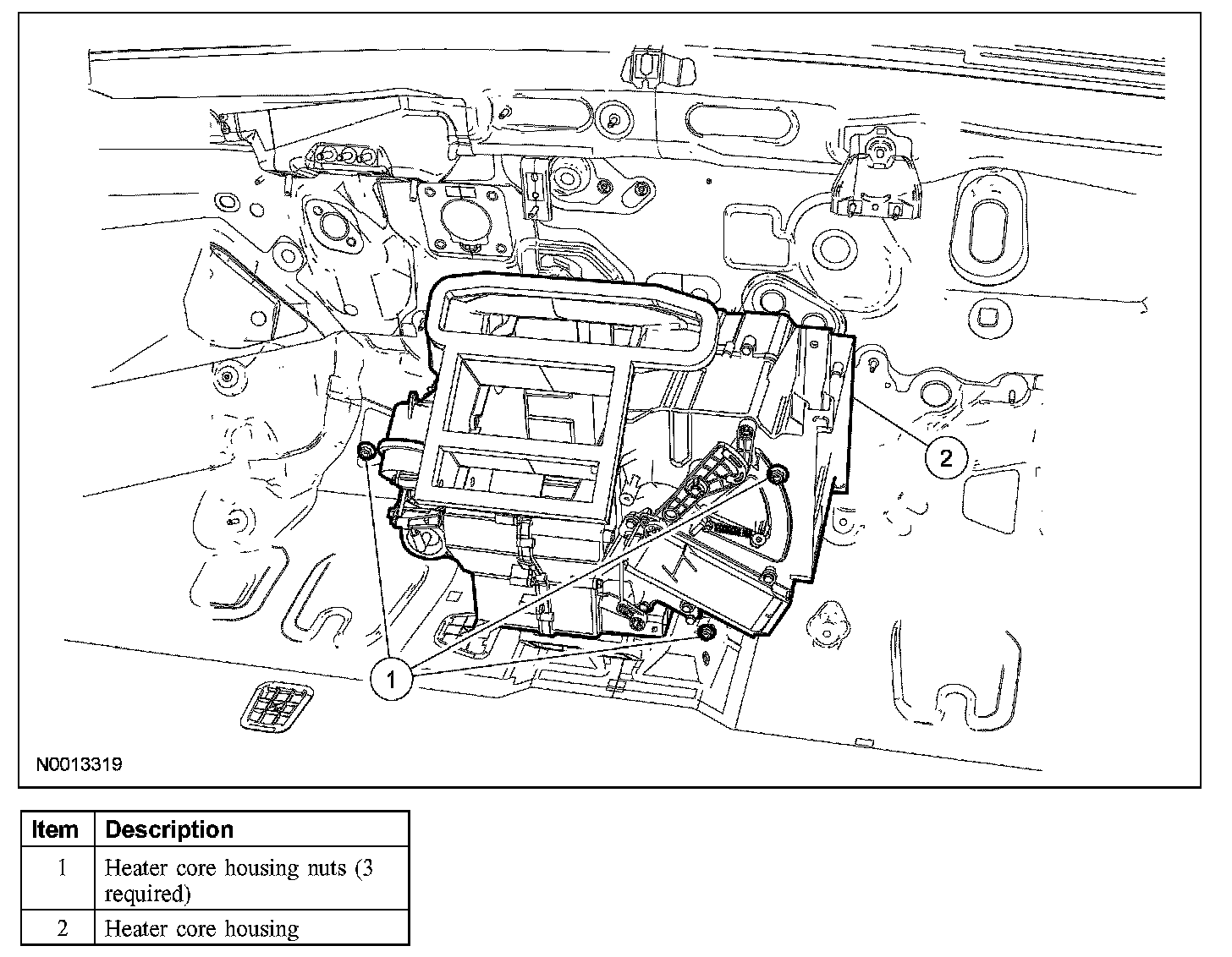 5. NOTE: Carefully remove the heater core housing to avoid spilling engine coolant in the passenger area.