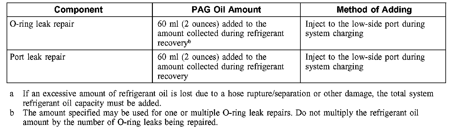 CAUTION: During normal A/C operation, oil is circulated through the system with the refrigerant, and a small amount is retained in each component. If certain components of the system are removed, some of the refrigerant oil will go with the component. To maintain the original total oil charge, it is necessary to compensate for the oil lost by adding oil to the system with the new part.