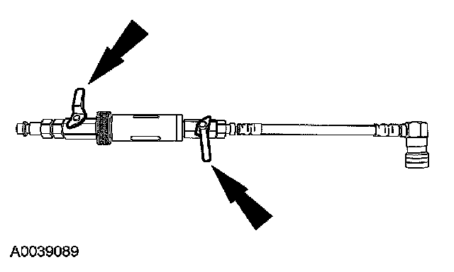 5. Install the dye/lubricant injector between the low-side gauge port valve and the refrigerant station or manifold gauge set.