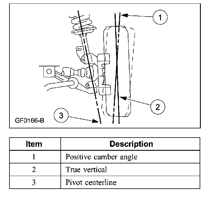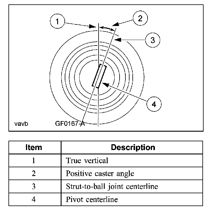 Caster is the deviation from vertical of an imaginary line drawn through the pivot points (top of strut and lower ball joint), when viewed from the side. The caster specifications will give the vehicle the best directional stability characteristics when loaded and driven. The caster setting is not related to tire wear.