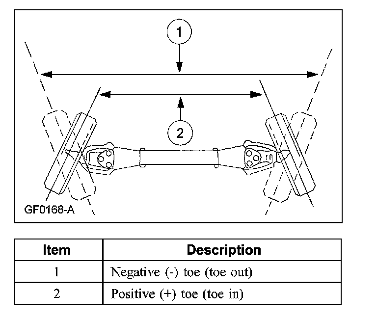 When the wheels are turned in toward the front of the vehicle, the toe is positive (+) (toe inch). When the wheels are turned out toward the front of the vehicle, the toe is negative (-) (toe out). This is measured in degrees, from side-to-side, and totaled.
