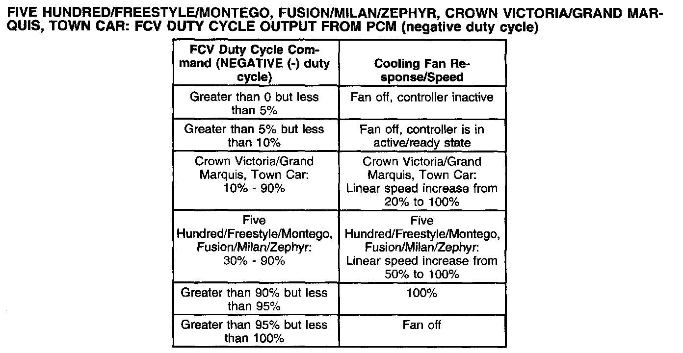 Five Hundred/Freestyle/Montego, Fusion/Milan/Zephyr, Crown Victoria/Grand Marquis, Town Car: FCV Duty Cycle Output From PCM (negative Duty Cycle):
