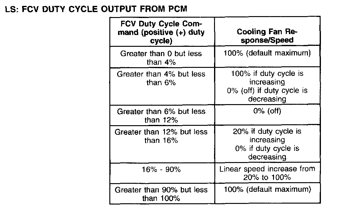 The PCM controls the fan speed and operation using a duty cycle output on the fan control variable (FCV) circuit. The fan controller (located at or integral to the engine cooling fan assembly) receives the FCV command and operates the cooling fan at the speed requested (by varying the power applied to the fan motor).