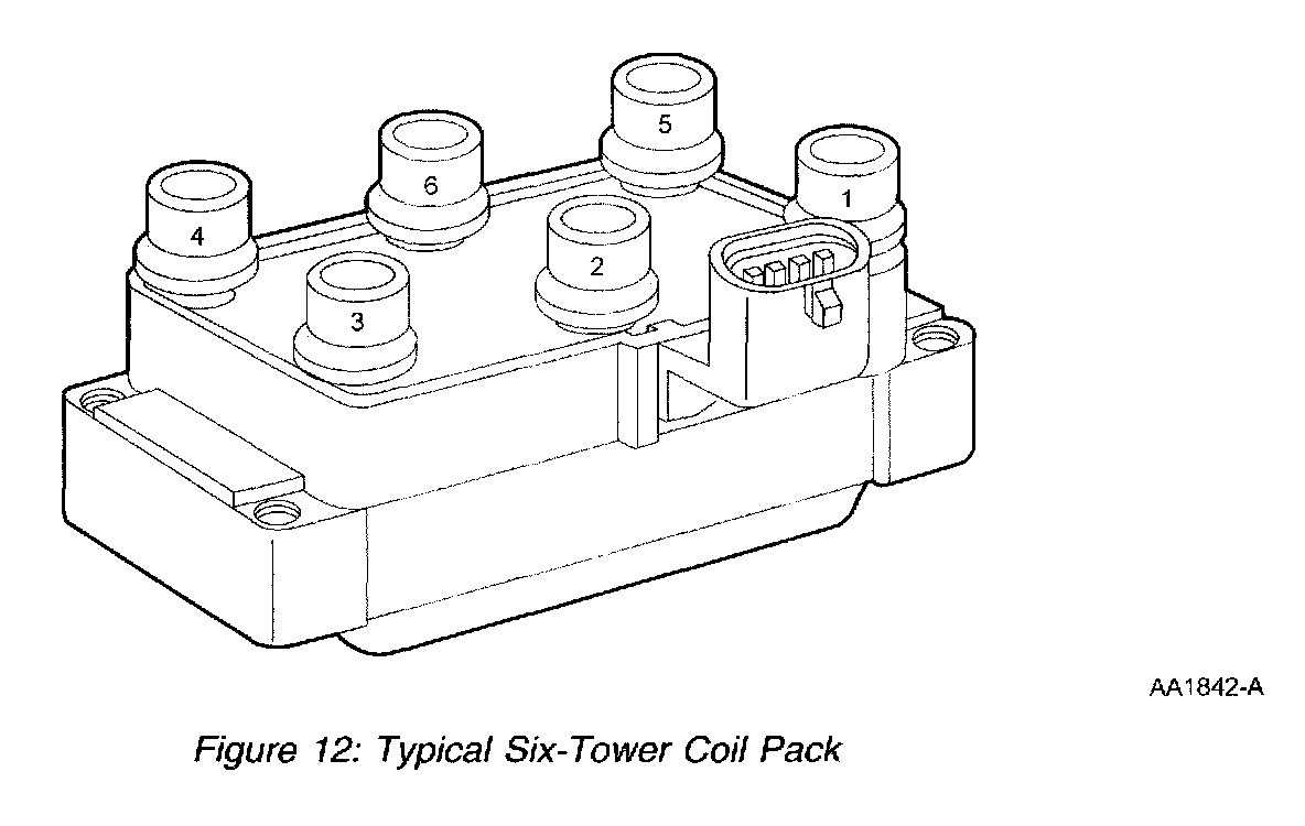 Coil packs come in 4-tower, 6-tower horizontal and series 5 6-tower models. Two adjacent coil towers share a common coil and are called a matched pair. For 6-tower coil pack (6 cylinder) applications, the matched pairs are 1 and 5, 2 and 6, and 3 and 4. For 4-tower coil pack (4 cylinder) applications, the matched pairs are 1 and 4, and 2 and 3.