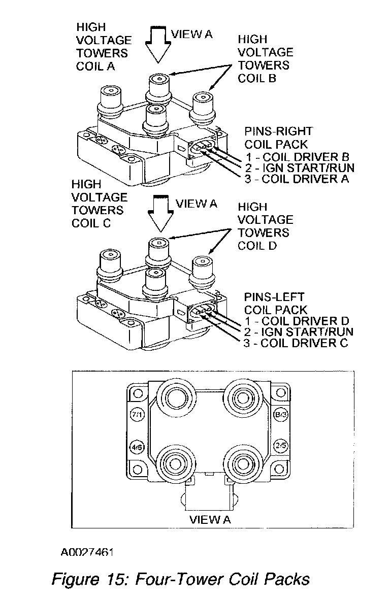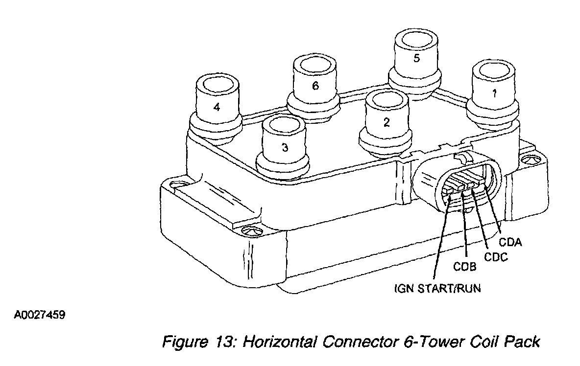 When the coil is fired by the PCM, spark is delivered through the matched pair towers to their respective spark plugs. The spark plugs are fired simultaneously and are paired so that as one fires on the compression stroke, the other spark plug fires on the exhaust stroke. The next time the coil is fired, the situation is reversed. The next pair of spark plugs fire according to the engine firing order.