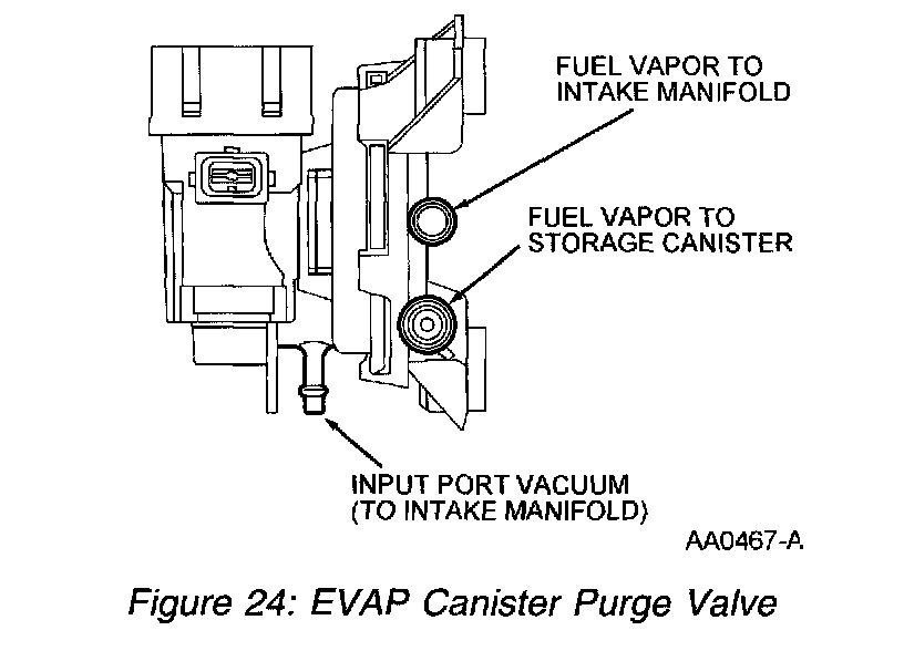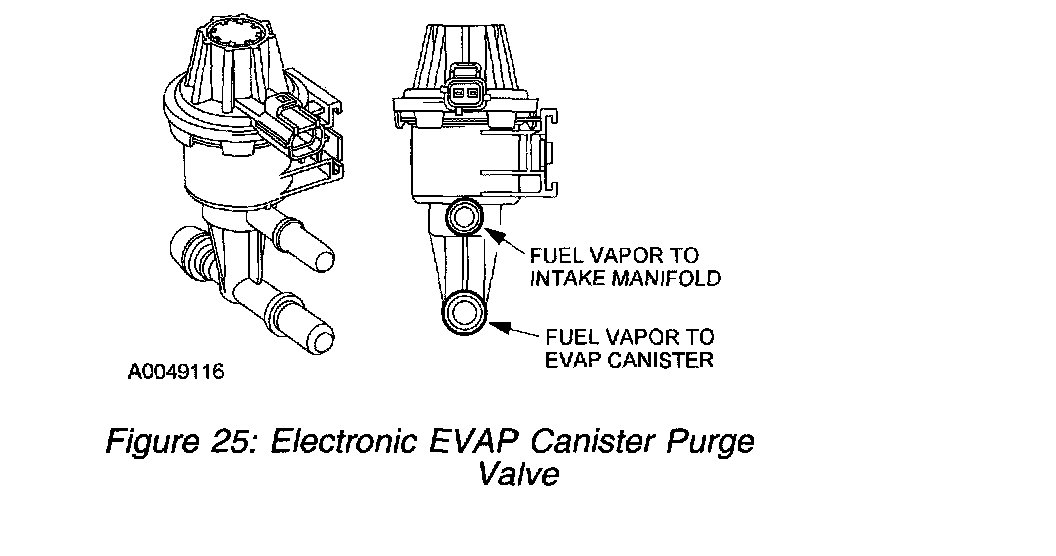 The EVAP canister purge valve is part of the enhanced EVAP system that is controlled by the PCM. This valve controls the flow of vapors (purging) from the EVAP canister to the intake manifold during various engine operating modes. The EVAP canister purge valve is a normally closed valve. The electronic EVAP canister purge valve controls the flow of vapors electronically by way of a solenoid thereby, eliminating the need for an electronic vacuum regulator and vacuum diaphragm. The PCM outputs a signal between 0% and 100% duty cycle to control the EVAP canister purge valve. On applications with an electronic EVAP canister purge valve, the PCM outputs a signal between 0 mA and 1,000 mA to control the solenoid.