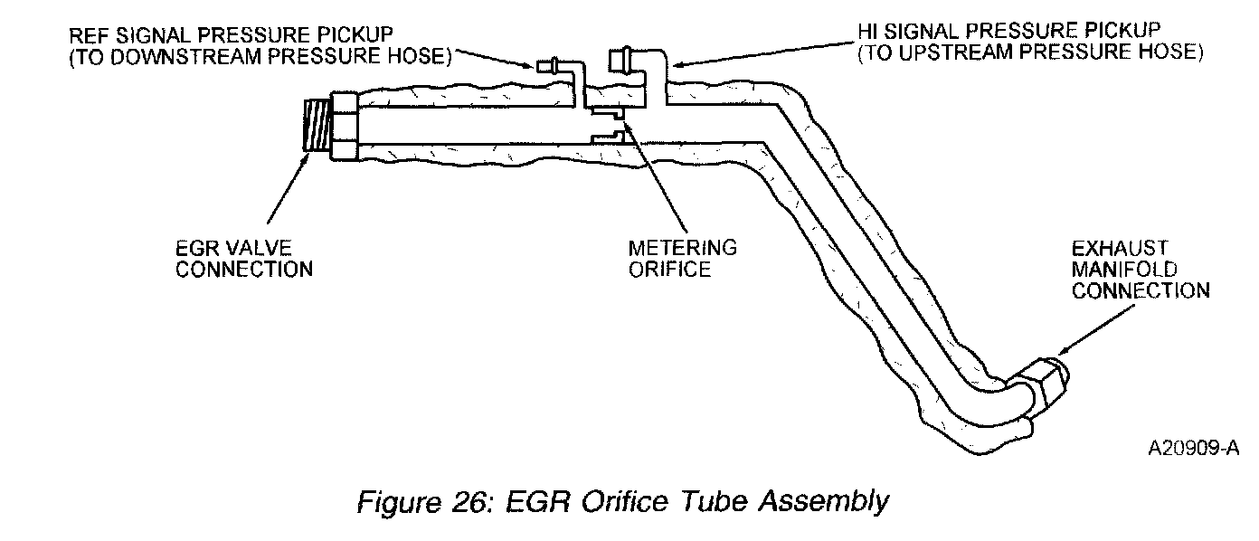 The orifice tube assembly is a section of tubing connecting the exhaust system to the intake manifold. The assembly provides the flow path for the EGR to the intake manifold and also contains the metering orifice and 2 pressure pick-up tubes. The internal metering orifice creates a measurable pressure drop across it as the EGR valve opens and closes. This pressure differential across the orifice is picked up by the differential pressure feedback EGR (DPFE) sensor which provides feedback to the powertrain control module (PCM).