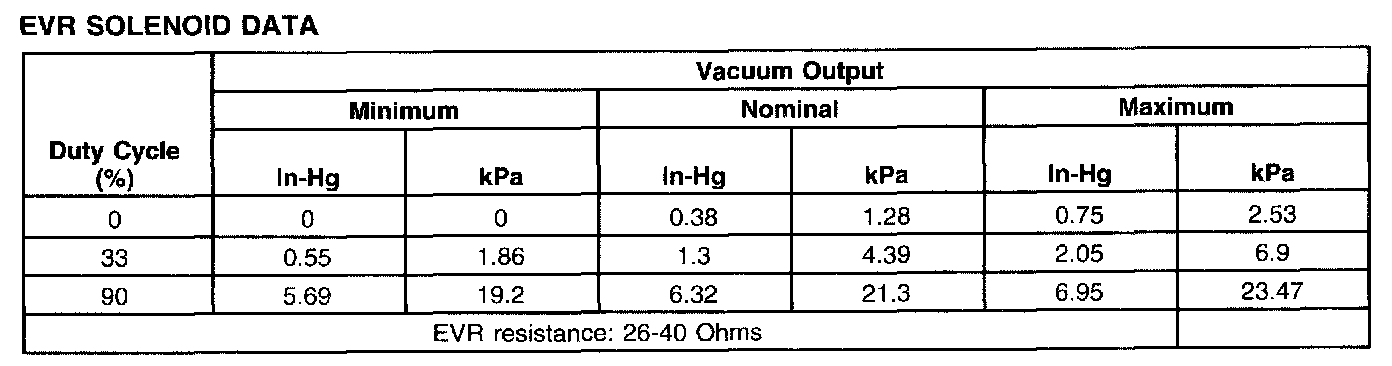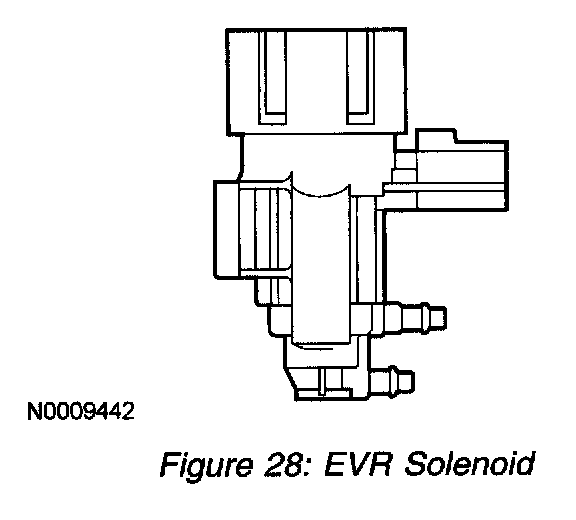 The EVR solenoid is an electromagnetic device which is used to regulate the vacuum supply to the EGR valve. The solenoid contains a coil which magnetically controls the position of a disc to regulate the vacuum. As the duty cycle to the coil increases, the vacuum signal passed through the solenoid to the EGR valve also increases. Vacuum not directed to the EGR valve is vented through the solenoid vent to atmosphere. Note that at 0% duty cycle (no electrical signal applied), the EVR solenoid allows some vacuum to pass, but not enough to open the EGR valve.