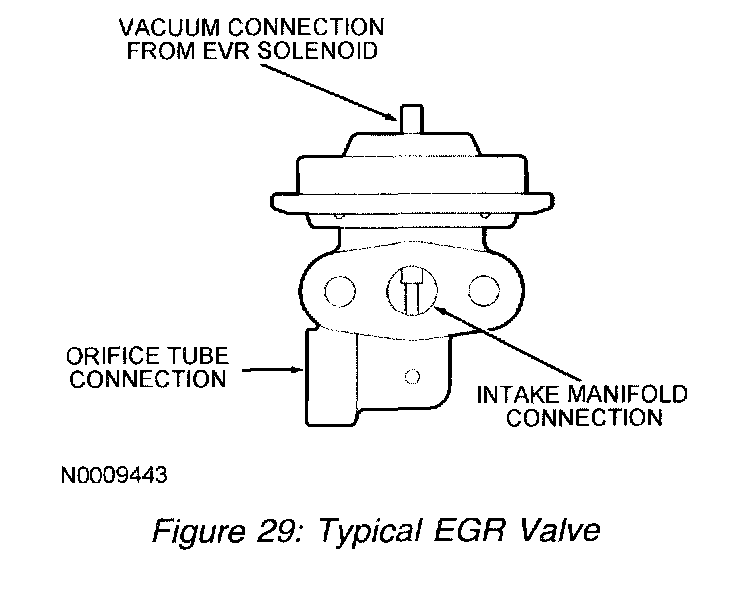 The EGR valve in the differential pressure feedback EGR (DPFE) system is a conventional, vacuum-actuated. The valve increases or decreases the flow of EGR. As vacuum applied to the EGR valve diaphragm overcomes the spring force, the valve begins to open. As the vacuum signal weakens, at 5.4 kPa (1.6 in-Hg) or less, the spring force closes the valve. The EGR valve is fully open at about 15 kPa (4.5 in-Hg).