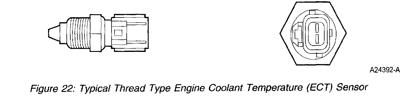 The ECT measures the temperature of the engine coolant. The PCM uses the ECT input for fuel control and for cooling fan control. There are 3 types of ECT sensors, threaded, push-in, and twist-lock. The ECT sensor is located in an engine coolant passage.