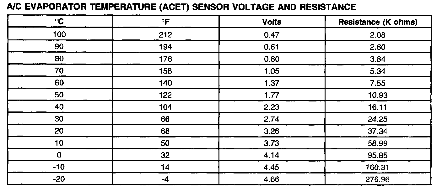 A/C Evaporator Temperature (ACET) Sensor Voltage And Resistance: