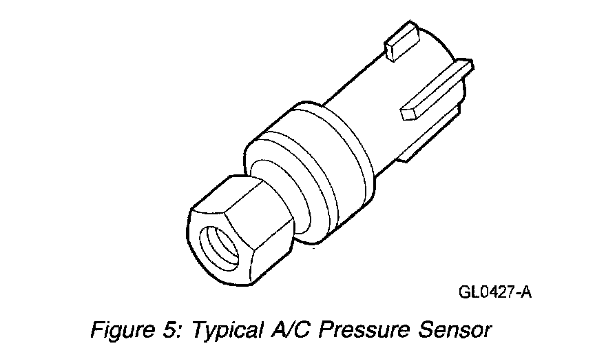 The ACP sensor is located in the high pressure (discharge) side of the A/C system. The ACP sensor provides a voltage signal to the PCM that is proportional to the A/C pressure. The PCM uses this information for A/C clutch control, fan control and idle speed control.