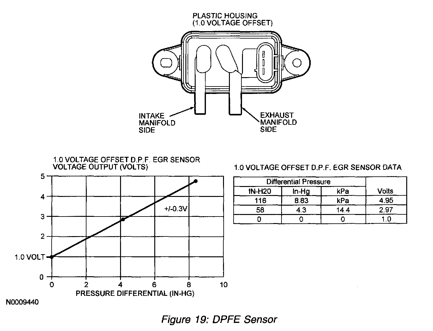 The DPFE sensor is a ceramic, capacitive-type pressure transducer that monitors the differential pressure across a metering orifice located in the orifice tube assembly. The differential pressure feedback sensor receives this signal through 2 hoses referred to as the downstream pressure hose (REF SIGNAL) and upstream pressure hose (HI SIGNAL). The HI and REF hose connections are marked on the DPFE sensor housing for identification (note that the HI signal uses a larger diameter hose). The DPFE sensor outputs a voltage proportional to the pressure drop across the metering orifice and supplies it to the powertrain control module (PCM) as EGR flow rate feedback.