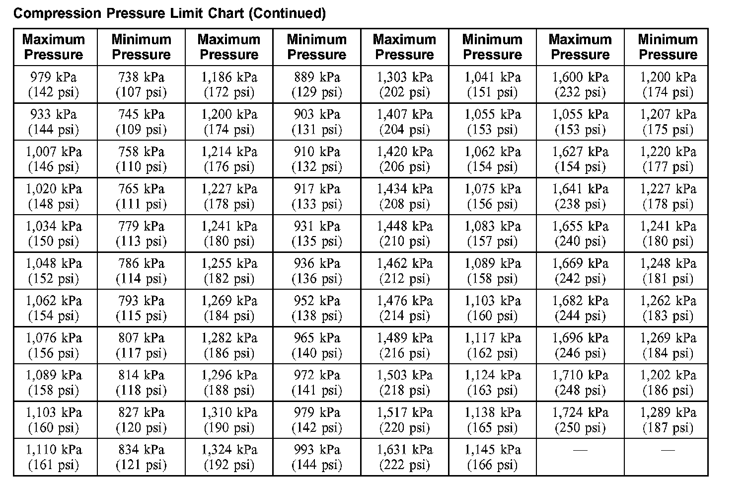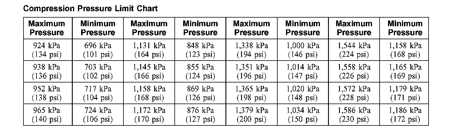 AllData Editors Note - Ford does not provide a cranking pressure specification, only an acceptable range.Compression Pressure Limit Chart (Part 1):