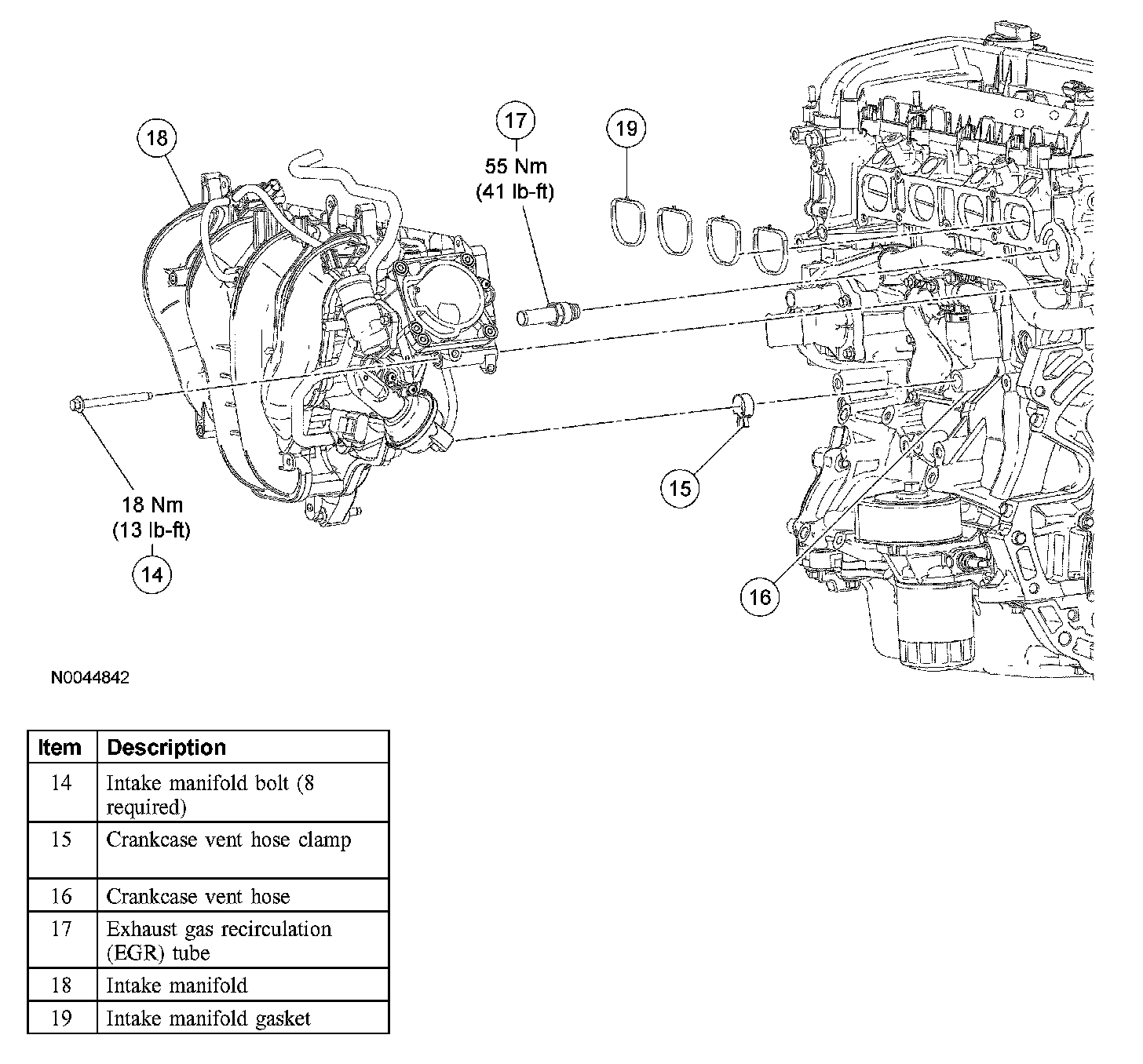Remove the 8 bolts and position the intake manifold aside to access the crankcase vent hose clamp and the EGR tube.