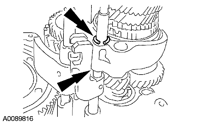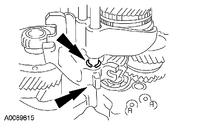 44. Release the circlip and allow the mainshaft to lower and engage the circlip. Measure and record the depth of the transaxle case to the mainshaft bearing surface.