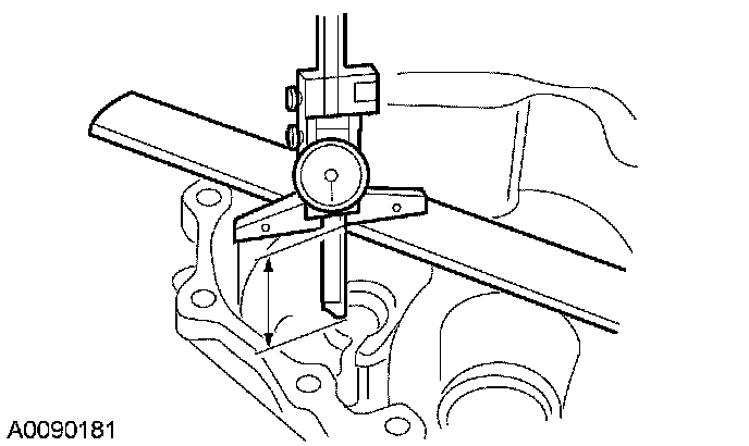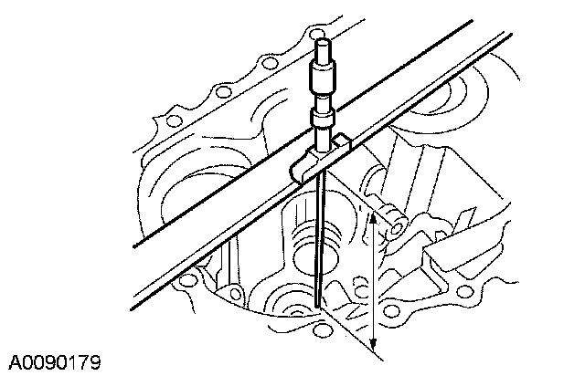54. Using a depth micrometer and a straight edge, measure and record the depth from the mating surface of the clutch housing to the reverse idler shaft bearing surface. Record this measurement as L2.