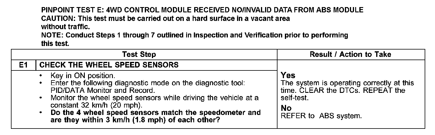 Pinpoint Test E: 4WD Control Module Received No/invalid Data From ABS ModuleNormal Operation