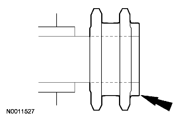 11. CAUTION: If one or both of the tensioner mounting bolts are loosened or removed, the tensioner-sealing bead must be inspected for seal integrity. If cracks, tears, separation from the tensioner body or permanent compression of the seal bead is observed, install a new tensioner or engine damage may occur.