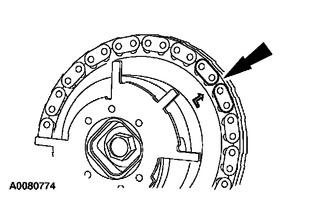 Position the timing chain on the camshaft sprocket with the camshaft sprocket timing mark positioned between the two copper (marked) chain links.