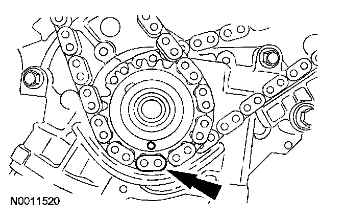 12. Position the lower end of the LH (inner) timing chain on the crankshaft sprocket, aligning the timing mark on the outer flange of the crankshaft sprocket with the single copper (marked) link on the chain.