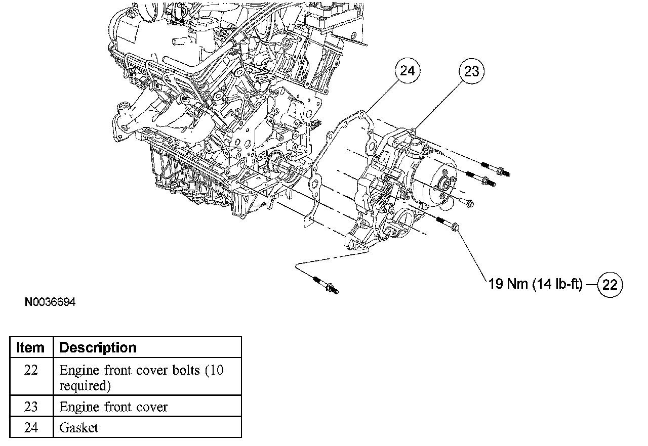 Remove the 10 bolts, the engine front cover and the gasket. Discard the gasket.