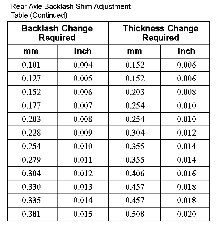 Rear Axle Backlash Shim Adjustment Table (part 2):