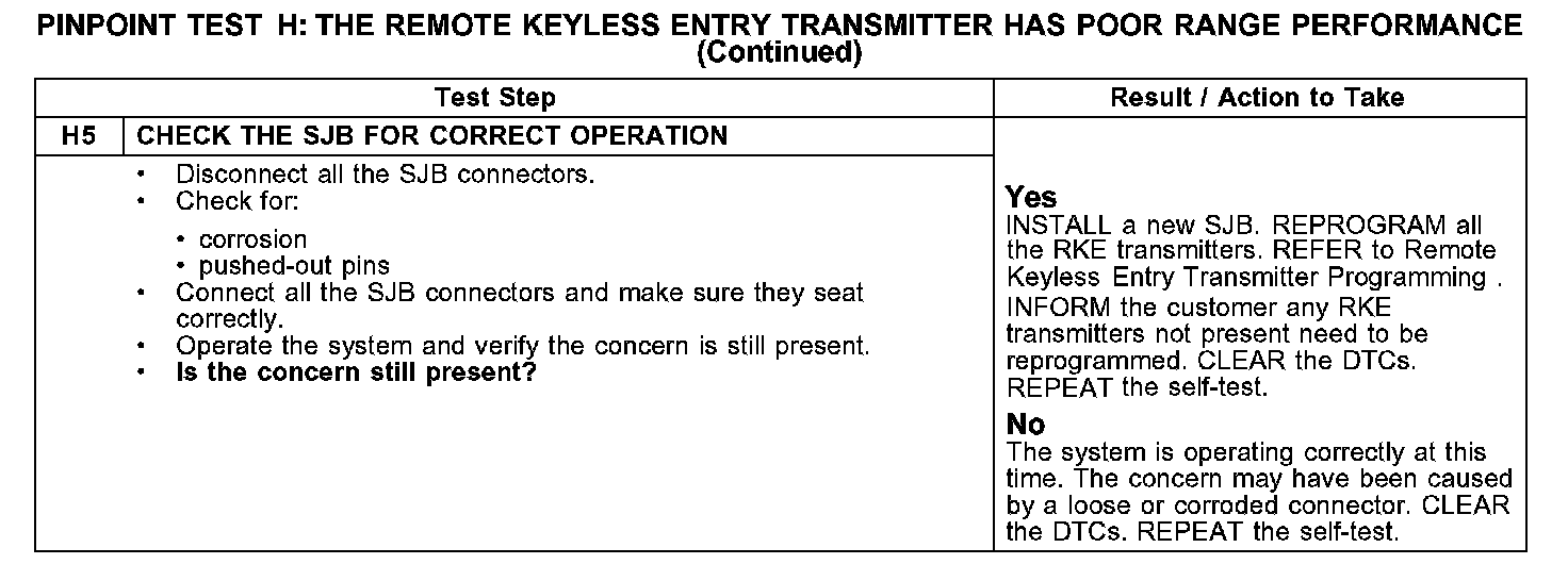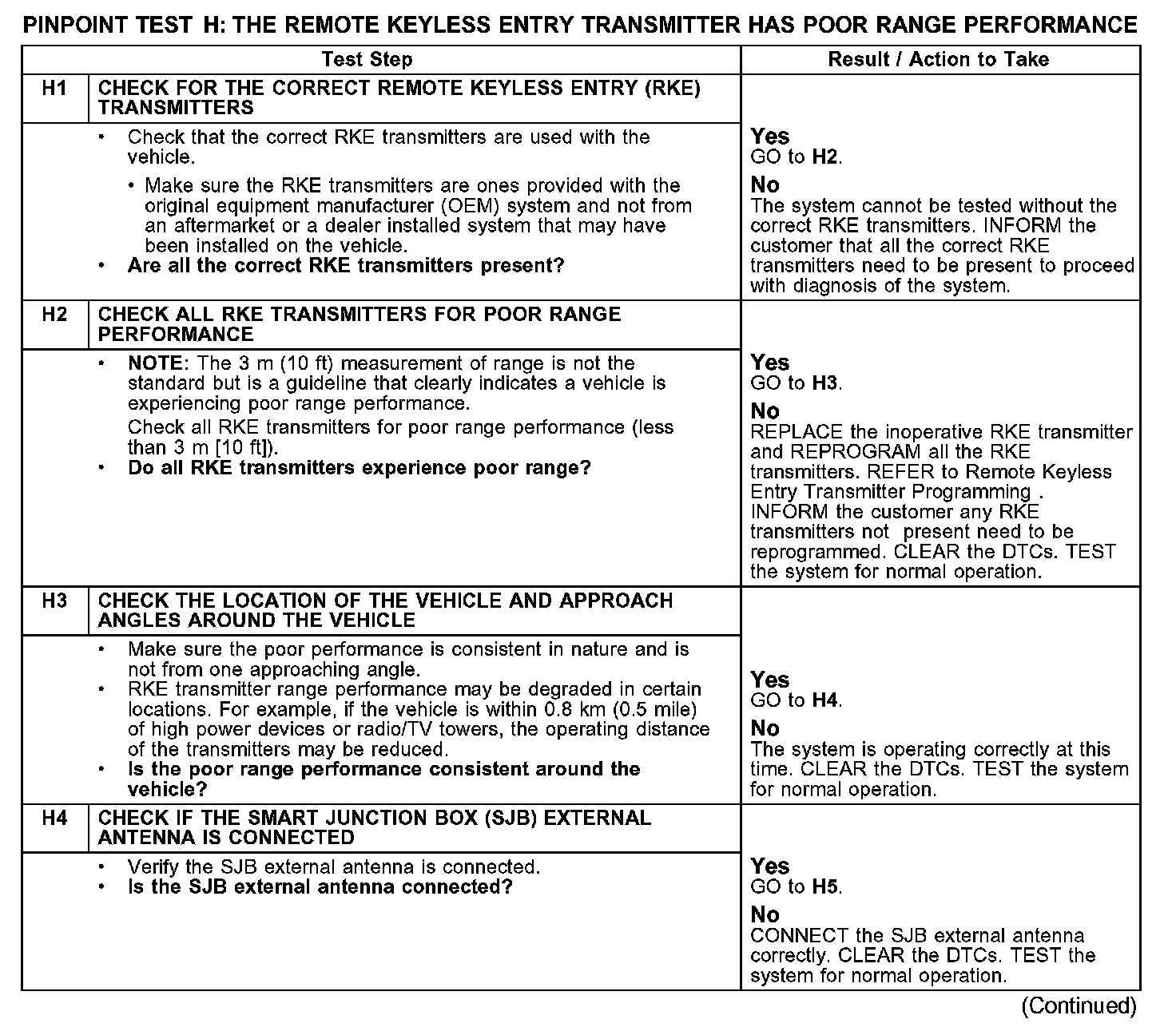 PINPOINT TEST H: THE REMOTE KEYLESS ENTRY TRANSMITTER HAS POOR RANGE PERFORMANCEH1-H4: