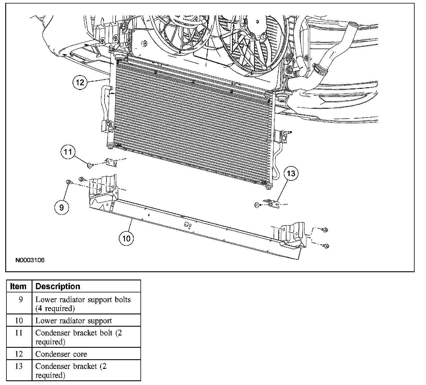 9. Correctly support the lower radiator support and remove the 4 lower radiator support bolts.