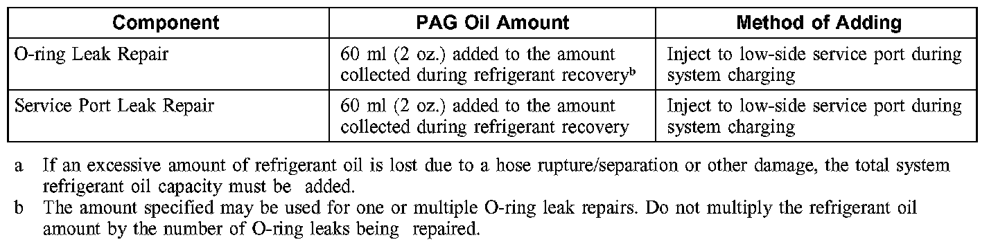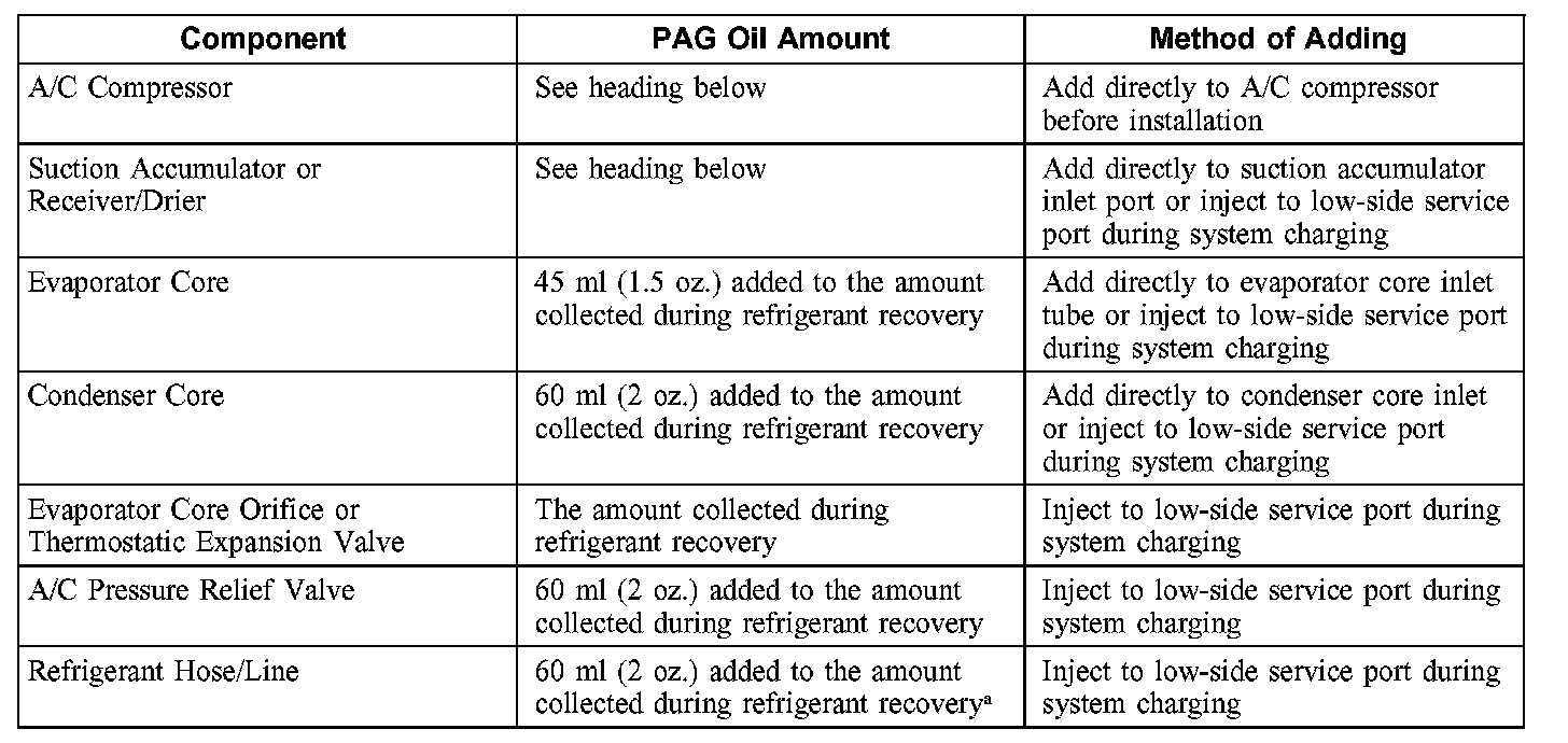 CAUTION: During normal A/C operation, oil is circulated through the system with the refrigerant, and a small amount is retained in each component. If certain components of the system are removed, some of the refrigerant oil will go with the component. To maintain the original total oil charge, it is necessary to compensate for the oil lost by adding oil to the system with the new part.