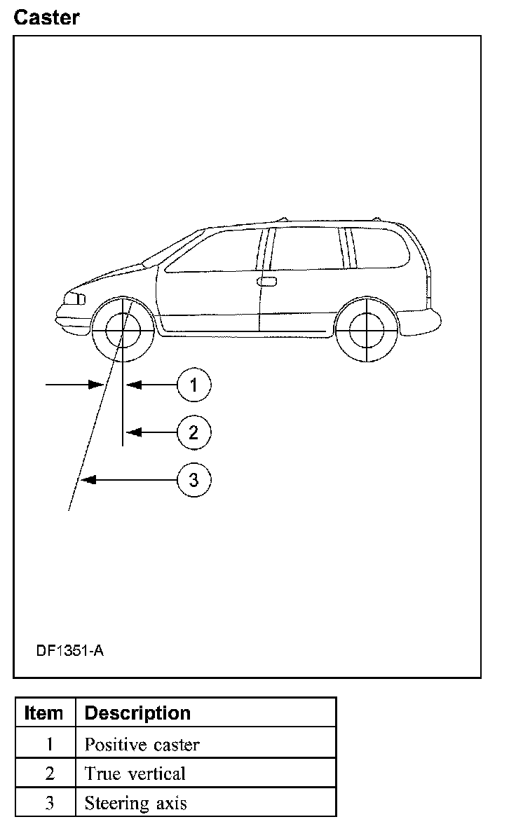 Caster is the deviation from vertical of an imaginary line drawn through the ball joints when viewed from the side. The caster specifications will give the vehicle the best directional stability characteristics when loaded and driven. The caster setting is not related to tire wear.