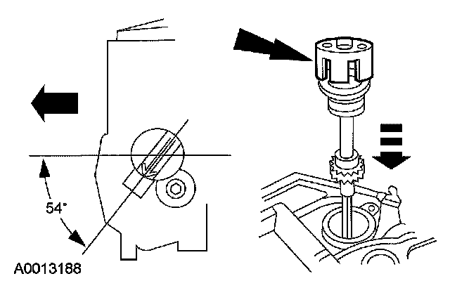 Install the camshaft synchronizer housing assembly so the arrow on the special tool is 54 degrees from the centerline of the engine.