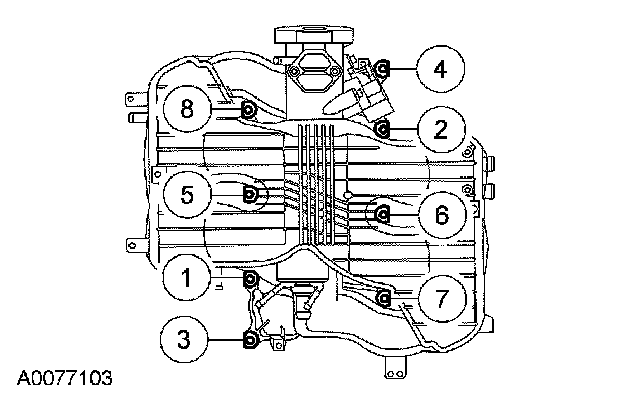 Install the 8 intake manifold bolts and tighten the upper intake manifold bolts in 2 stages in the sequence shown.