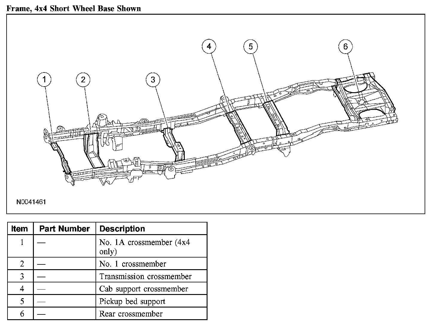 The No. 1A (4x4 only) and the No. 1 crossmembers are welded to the frame side rails. The remaining frame crossmembers are riveted and/or bolted into place.
