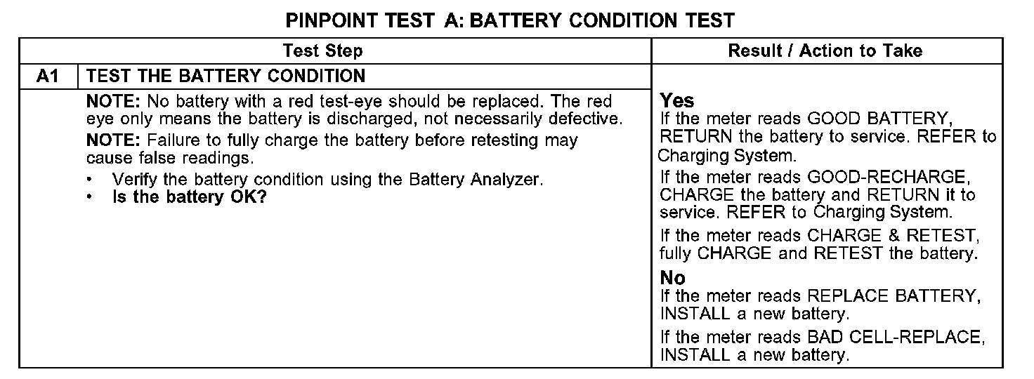 PINPOINT TEST A: BATTERY CONDITION TEST