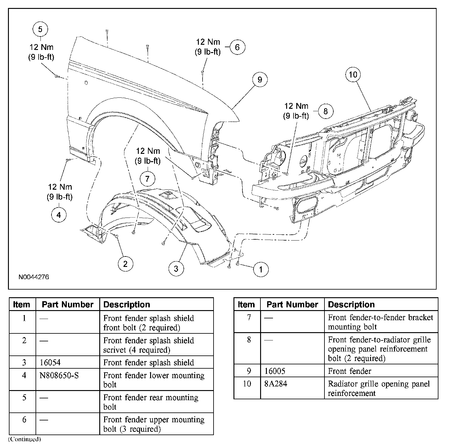 9. NOTE: The LH upper front fender is equipped with 5 bolts securing the fender to the vehicle. The RH upper front fender is equipped with 3 bolts.